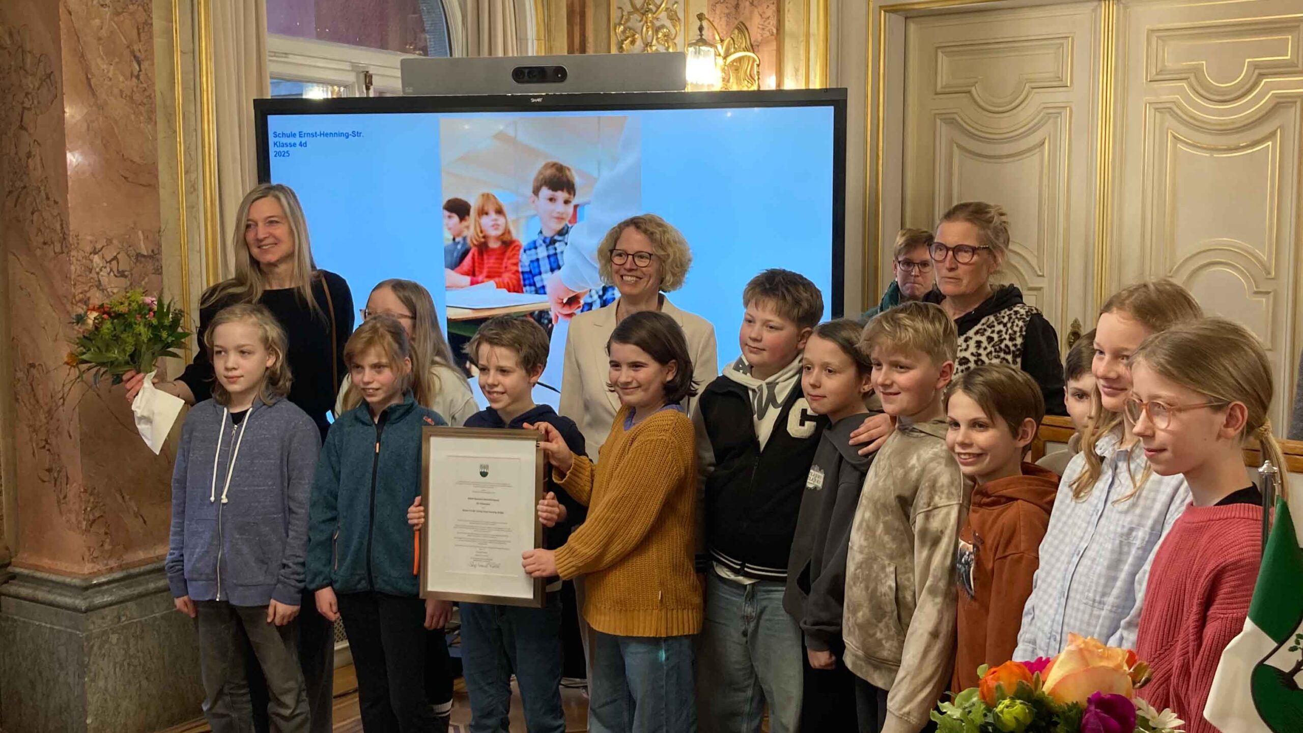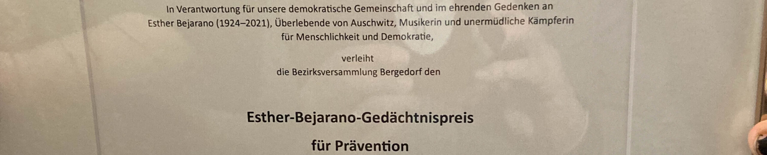 Das Projekt wurde als Bewerbung für den jährlichen Wettbewerb des Esther-Bejarano-Preises der Bezirksversammlung Bergedorf von Frau Biesterfeld eingereicht. Mit großer Freude und auch Überraschung wurden wir informiert, dass das Projekt der 4d den Ehrenpreis mit zwei weiteren Projekten/ Preisträgern erhalten hat. In der Laudatio der Bezirksamtsleiterin und der Bezirksversammlungsleiterin wird gerade die Bedeutung von demokratischem Engagement junger Menschen für eine offene Gesellschaft hervorgehoben. Die Klasse 4d war erstaunlich vielfältig mit SuS und Eltern vor Ort im Spiegelsaal des Rathauses vertreten. Das Projekt wurde noch vor den beiden anderen Projekten als besonders herausragend gewürdigt.